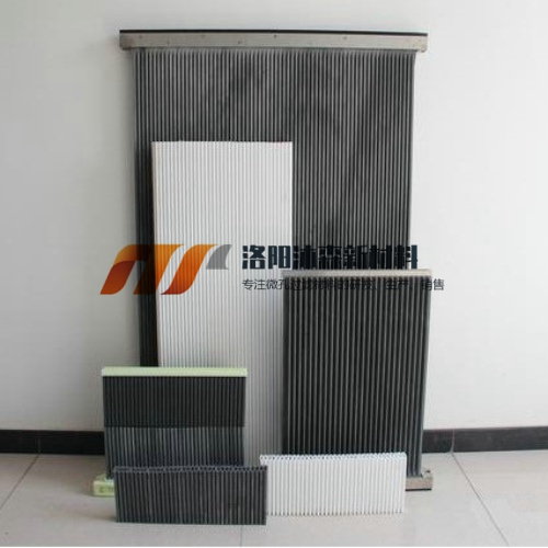 塑燒板濾芯呈剛性波浪式多孔結(jié)構(gòu),板厚約4mm,其內(nèi)部形成大約30μm的均勻孔隙,然后通過特殊的噴涂工藝在母體表面的空隙里填充PTFE涂層,形成2~3μм的微孔。